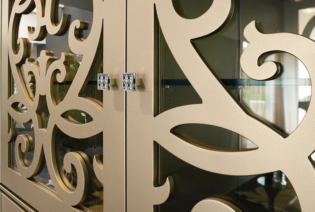 Storage units manufactured in micro-embossed MDF with laser technique cut doors, tempered glass and Swarovski® doorknobs. A design reminiscent of Arabic motifs makes this collection unique and elegant. It not only looks elegant as a storage unit but also looks incredibly beautiful as a screen for dividing large spaces.