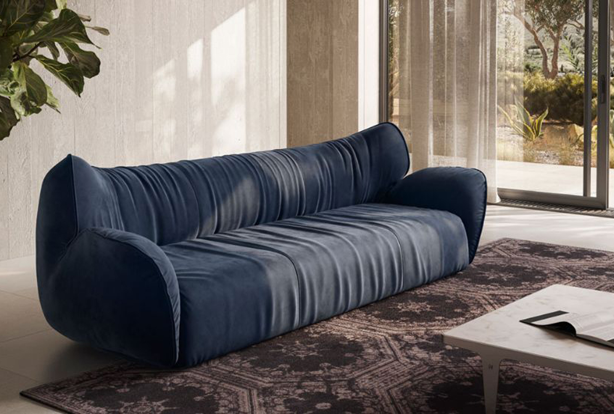 Collections > sofas Massimo Iosa Ghini's Juno symbolises Mediterranean comfort with the soft, enveloping shape that evokes a cosy nest, a refuge that welcomes and embraces. The abundant coverings fold into loops under the weight and shape it contains. Juno is available as a 2-seater with or without a chaise and as a 3-seater. It comes in a variety of leather and fabric upholstery.